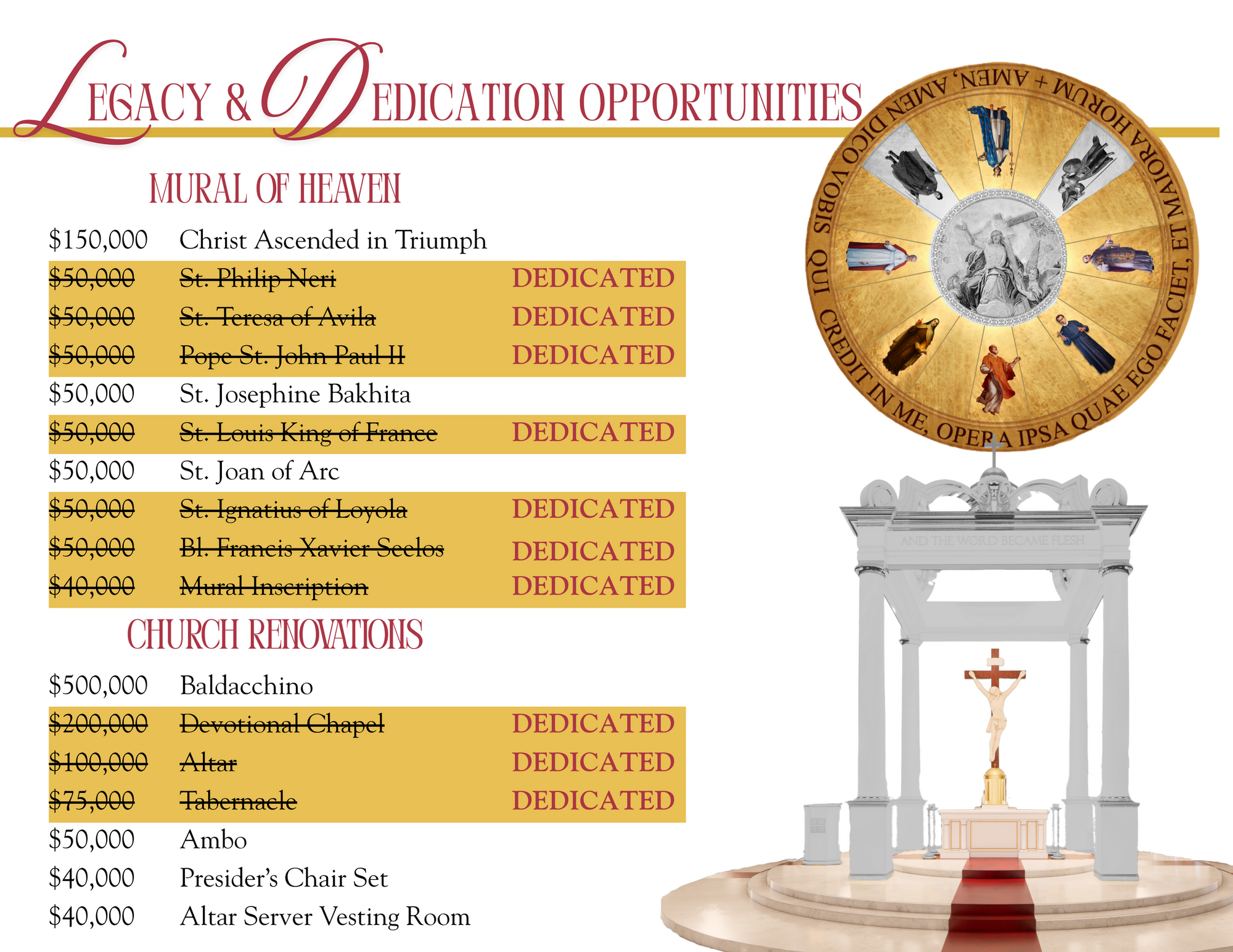 Would you like to honor a loved one or leave a lasting legacy? Our Capital Campaign offers dedication and naming opportunities that allow your gift to bless the parish family for years to come.
